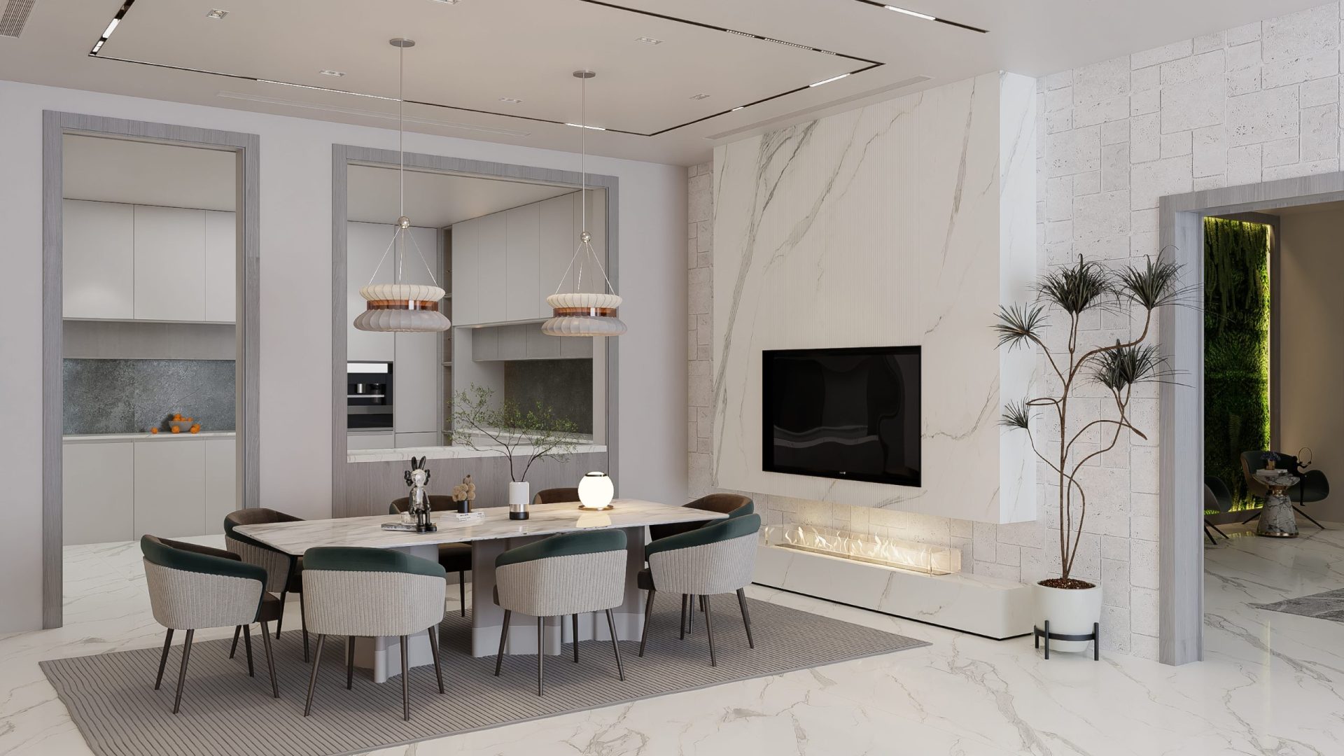 - At the center, the dining area stands out with custom designed furniture, soft upholstery, and sculptural pendant lighting that creates a welcoming ambiance. Behind it, the kitchen showcases smooth, handle-less cabinetry and a refined backsplash, seamlessly connecting the two spaces.