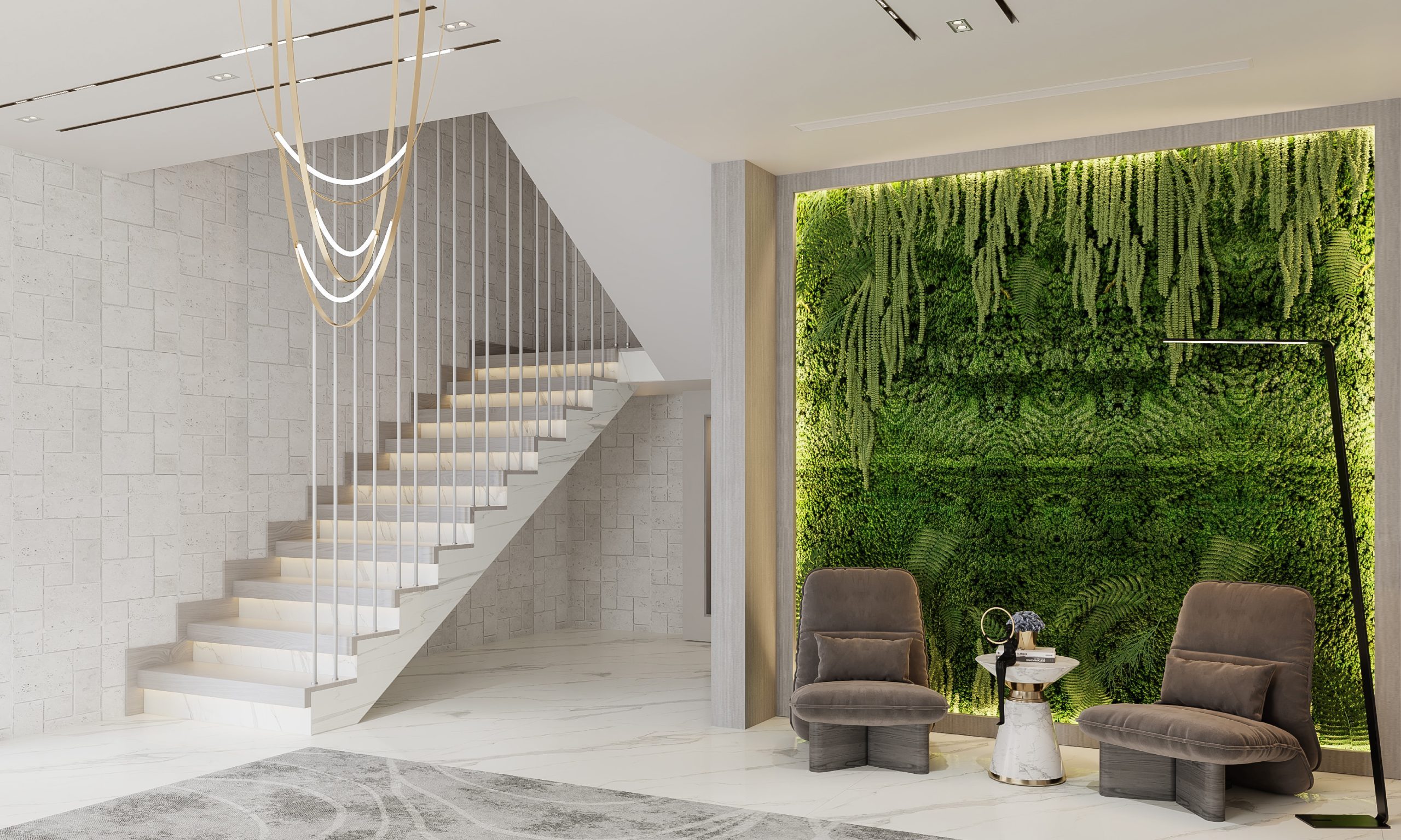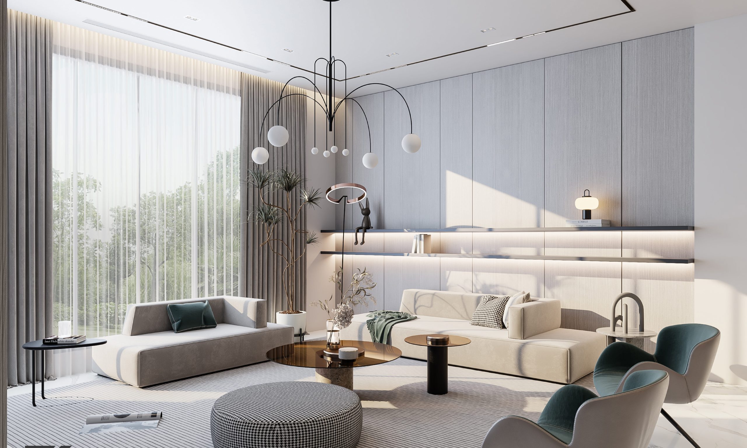 This residence showcases the beauty of modern contemporary architecture, where minimalism meets luxury. The interior is defined by clean geometric lines, a soft neutral palette, and strategically layered lighting, creating an atmosphere that is both warm and sophisticated. Natural light floods the spaces through expansive openings, highlighting every carefully crafted detail within the smart system for all the spaces.