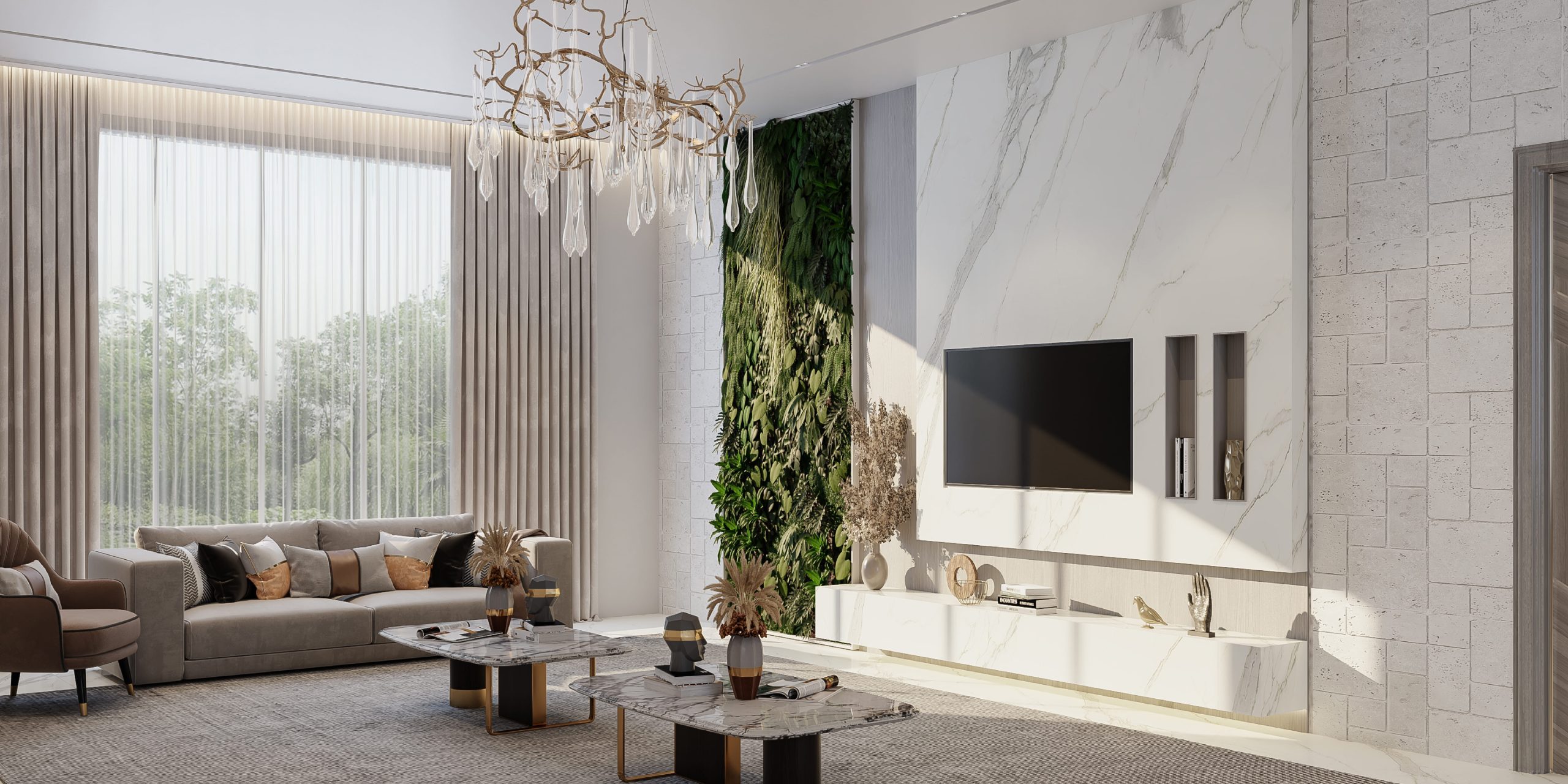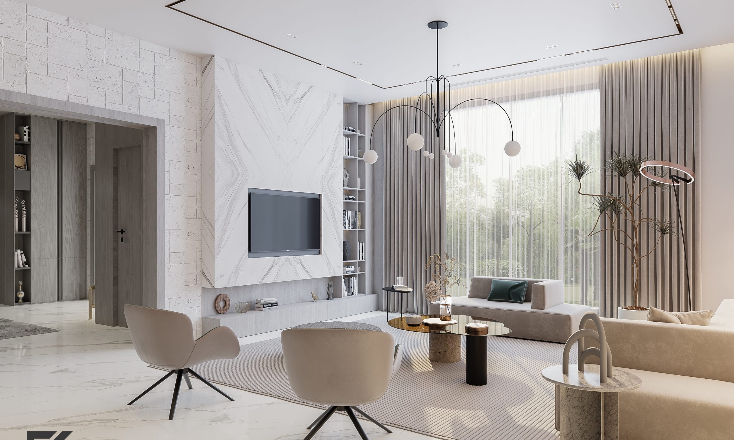 - Anchored by a sleek marble wall with delicate veining, featuring a minimalist built-in fireplace and TV, the design is balanced, warm, and visually striking. A soft neutral palette of whites, warm greys, and earthy tones allows the materials to shine..