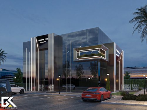 A distinctive glass-clad sales office building marks the entrance, serving as a contemporary focal point and welcoming gateway to the community.